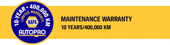 Under the NAPA AUTOPRO banner, we provide exceptional benefits such as the Peace of Mind Warranty and the 10/400 Maintenance Warranty. These warranties ensure top-quality service and peace of mind. Our Peace of Mind warranty offers 24 months or 40,000 km of worry-free protection on eligible work or repairs, valid anywhere in North America.
